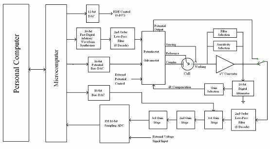 600E為通用電化學(xué)測量系統(tǒng)。下圖為儀器的硬件結(jié)構(gòu)示意圖。儀器內(nèi)含快速數(shù)字信號(hào)發(fā)生器,用于高頻交流阻抗測量的直接數(shù)字信號(hào)合成器,雙通道高速數(shù)據(jù)采集系統(tǒng),電位電流信號(hào)濾波器,多級(jí)信號(hào)增益,iR降補(bǔ)償電路,以及恒電位儀/恒電流儀(660E)。電位范圍為10V,電流范圍為250mA。電流測量下限低于10pA?芍苯佑糜诔㈦娚系姆(wěn)態(tài)電流測量。如果與 200B微電流放大器及屏蔽箱連接,可測量1pA或更低的電流。如果與