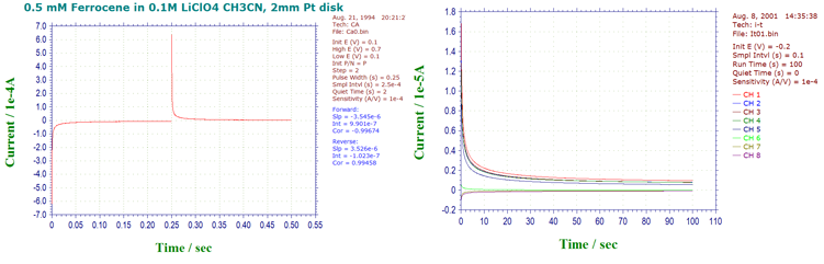 恒電位儀 零阻電流計(jì) 2,3,4電結(jié)構(gòu) 浮動(dòng)地線或?qū)嵉?span lang="EN-US"> 大電位范圍:±10V 大電流:±250mA連續(xù),±350mA峰值 槽壓:±13V 恒電位儀上升時(shí)間:小于1s,通常0.8s 恒電位儀帶寬(-3分貝):1MHz 所加電位范圍:±10mV, ±50mV, ±100mV, ±650mV, ±3.276V, ±6.553V, ±10V 所加電位分辨:電位范圍的0.0015% 所加電位準(zhǔn)確度:±1mV,±滿量程的0.01% 所加電位噪聲:<10V均方根植 測量電流范圍:±10pA至± 測量電流分辨:電流量程的0.0015%,低0.3fA 電流測量準(zhǔn)確度:電流靈敏度大于等于1e 輸入偏置電流:<20pA 恒電流儀( 660E) 恒電流范圍:3nA–250mA 所加電流準(zhǔn)確度:如果電流大于3e 所加電流分辨率:電流范圍的0.03% 測量電流范圍:±0.025V,±0.1V,±0.25V,±1V,±2.5V,±10V 電位計(jì) 參比電輸入阻抗:1e12歐姆 參比電輸入帶寬:10MHz 參比電輸入偏置電流:<=10pA @ 波形發(fā)生和數(shù)據(jù)獲得系統(tǒng) 快速信號(hào)發(fā)生更新速率:10MHz,16位分辨 快速數(shù)據(jù)采集系統(tǒng):16位分辨,雙通道同步采樣,采樣速率每秒1,000,000點(diǎn) 外部信號(hào)記錄通道高采樣速率:1MHz 可拓展掃描電化學(xué)顯微鏡功能 |