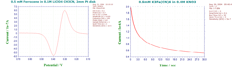 實(shí)驗(yàn)參數(shù) CV和LSV掃描速度:0.000001V/s至10,000V/s 掃描時(shí)的電位增量:0.1mV(當(dāng)掃速為1,000V/s時(shí)) CA和CC的脈沖寬度:0.0001至1000sec CA和CC的小采樣間隔:1s CC模擬積分器 DPV和NPV的脈沖寬度:0.001至10sec SWV頻率:1至100kHz i-t的小采樣間隔:1s ACV頻率范圍:0.1至10kHz SHACV頻率范圍:0.1至5kHz FTACV頻率范圍:0.1至50Hz,可同時(shí)獲取基波,二次諧波,三次諧波,四次諧波,五次諧波,六次諧波的ACV數(shù)據(jù) 交流阻抗:0.00001至1MHz 交流阻抗波形幅度:0.00001V至0.7V均方根值 其他特點(diǎn) 自動(dòng)或手動(dòng)iR降補(bǔ)償 電流測量偏置:滿量程,16位分辨,0.003%準(zhǔn)確度 電位測量偏置:±10V,16位分辨,0.003%準(zhǔn)確度 外部電位輸入 電位和電流的模擬輸出 可控電位濾波器的截止頻率:1.5MHz,150KHz,15KHz,1.5KHz,150Hz,15Hz,1.5Hz, 0.15Hz 可控信號(hào)濾波器的截止頻率:1.5MHz,150KHz,15KHz,1.5KHz,150Hz,15Hz,1.5Hz, 0.15Hz 旋轉(zhuǎn)電控制電壓輸出( 630E以上型號(hào)): 0-10V對用于0-10000rpm的轉(zhuǎn)速,16位分辨,0.003%準(zhǔn)確度,需要某些旋轉(zhuǎn)電裝置才能工作 通過宏命令可以控制數(shù)字輸入輸出線 內(nèi)閃存儲(chǔ)器可迅速更新程序 串行口或USB口數(shù)據(jù)通訊 電解池控制:通氮,攪拌,敲擊(需要特殊電解池系統(tǒng)) CV數(shù)字模擬器和擬合器。用戶定義反應(yīng)機(jī)理( 630E以上)或預(yù)定義反應(yīng)機(jī)理(其他型號(hào)) 交流阻抗模擬器和擬合器(具有交流阻抗測量功能的型號(hào)) 大數(shù)據(jù)長度:256K-16384K可選 儀器尺寸: |