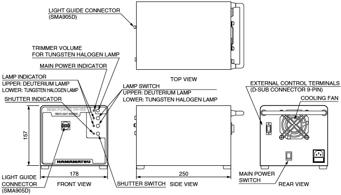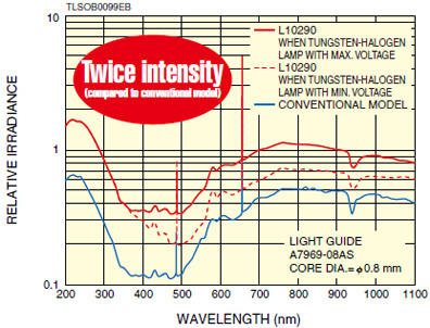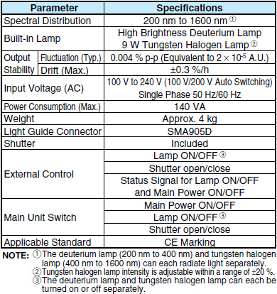通過使用安裝在同一外殼內(nèi)的高亮度氘燈和鹵鎢燈,該光源能通過光波導(dǎo)(單賣)輸出200nm1600nm的光。輸出的光強大約是現(xiàn)有型號的兩倍。緊湊的尺寸和較輕的重量使其易于攜帶。機械快門和外部控制等實用的功能使其易于使用。這種新型光源同時適用于多種型號的便攜式設(shè)備。