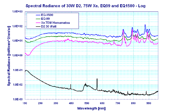 • The spectral radiance (brightness) of the LDLS exceeds that of traditional Xe and Deuterium sources