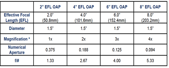 • Magnification is based on an OAP pair with 2” EFL OAP as the collecting mirror and