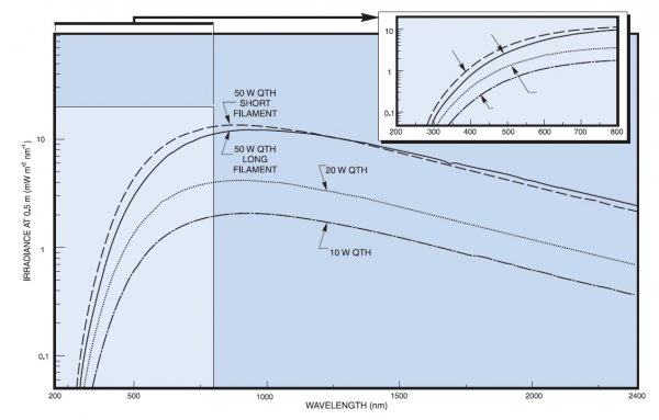 The Light Source uses different power lamps as its illumination source. This Tungsten Halogenlamp exhibit better output stability than arc lamps and do not produce strong UV light emission or toxic ozone. Their smooth spectral output curve make them useful for radiometric and photometric applications.