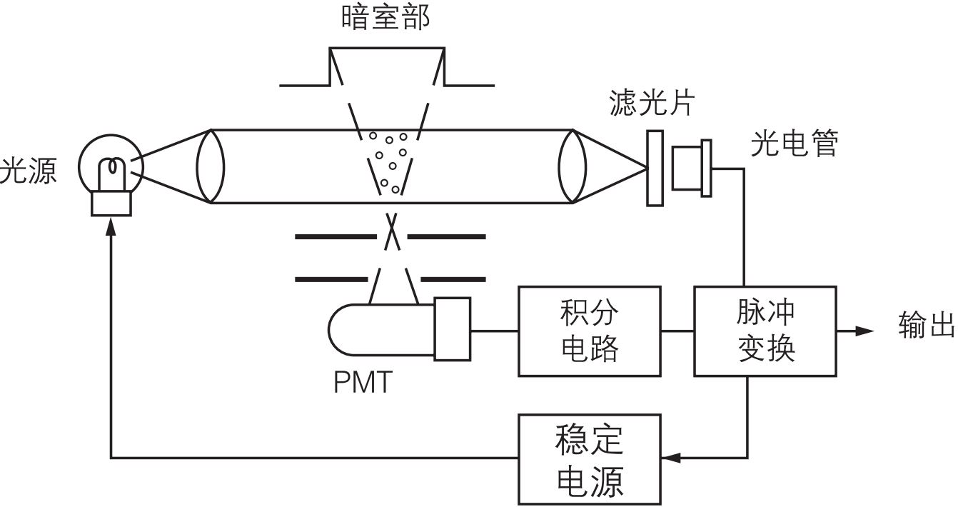 測試方法使用光散射及β線吸收等,F(xiàn)ig.1 是原理圖。如果光通過的地方有浮游粒子,光照到浮游粒子上就會產(chǎn)生散射,浮游粒子越多,散射光越強且和浮游粒子的量成比例。在這種儀器中,用光電倍增管來接收該散射光,將此信號積分后變換成脈沖信號,使其輸出和濃度相對應(yīng)。因為這種方法對濃度的變化能立刻跟蹤,因此適用于要監(jiān)視連續(xù)且長時間變化的場合。