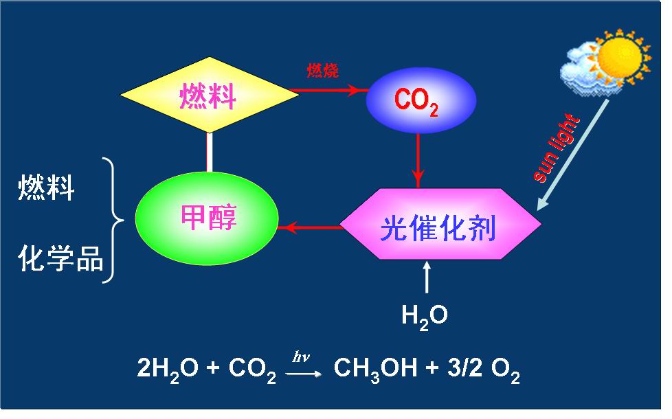 其二是原位條件下將上述兩個反應(yīng)在一個催化體系中實現(xiàn)。即,利用太陽能光催化直接將CO2+H2O轉(zhuǎn)化為CH3OH。此過程的關(guān)鍵科學(xué)問題是:(1)發(fā)展兼具有分解水制氫和CO2加氫的光催化劑;(2)將生成的氧能及時脫附離開催化劑的表面,避免氧化逆反應(yīng)地發(fā)生。