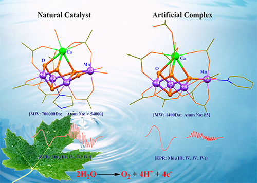 中國科學院化學研究所光化學實驗室光生物小組科研人員自1997年以來一直從事光合作用水裂解催化中心的結構和機理研究,并在1999年成功預測出該催化中心的關鍵輔基Ca離子的結合方式Chin. Sci. Bull. 1999,44,2209-2215)。2000年以來,借助低溫電子順磁共振(EPR對水裂解過程中電子和質子轉移及金屬催化中心結構變化規(guī)律開展了系列研究Biochemistry 2003, 42, 8066-8076; Biochemistry 2004, 43, 13787-13795;Biochim. Biophys. Acta, 2006, 1757, 781-786Biochim. Biophys. Acta 2007, 1767, 493-499;Biochim. Biophys. Acta 2008, 1777, 1109-1115;Photosyn. Res., 2009, 99:127-138; Biochim. Biophys. Acta 2010, 1797, 339-346;Biochim. Biophys. Acta 2010, 1797, 1421-1427;J. Photochem. Photobiol. B 2014,138, 249-255近年,該課題組基于前期對生物水裂解催化中心的深刻認識,開展了人工模擬光合作用研究,后合成得到MnO簇、MnSrOMnCaO系列金屬簇合物Chin. Sci. Bull. 2013, 58, 3213-3216; Chem. Commun. 2014, 50, 9263-9265; Dalton Trans. 2015, 44, 4431-4435)。這些工作從實驗上解決了Ca/Sr離子難以與Mn離子通過橋m-O2-連接的難題同時也找到如何通過控制外圍配體來穩(wěn)定高價Mn簇合物的方法。