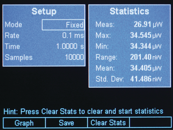 能夠進(jìn)行脈沖峰間測(cè)量,在樣本速率為250 kHz 時(shí),重復(fù)頻率高達(dá)4 kHz。脈沖、峰間和DC 光源測(cè)量可以W、dBm、dB、J、A、V 和Sun 等為單位進(jìn)行顯示,取決于使用的探測(cè)器類型。